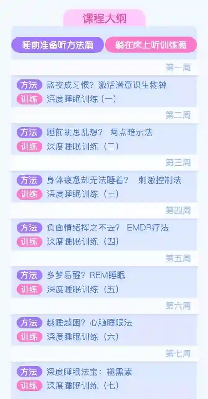 ②睡眠引导(音频)——找到病根后对症下药,通过音频引导你建立正常的睡眠节律,每天晚上听着听着就能安然入眠。