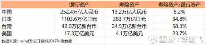 中国寿险资产和银行资产相比,只有5.2%,美国、日本、台湾是这个比值的4倍至11倍。