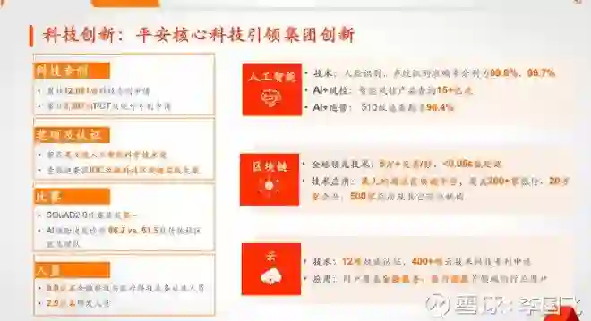 平安每年将收入的1%用于科技研发。拥有业界一流的研发团队,科技研发人员2.9万名,截至2018年底,科技专利申请数较年初增加9,021项,累计达12,051项,位居国际金融机构前列,其中PCT及境外专利申请数量累计达3,397项,在“2018年全球金融科技发明专利排行榜”中,排名第一。下图是近年平安在人工智能、区块链和云等高科技领域所取得的一些成绩。