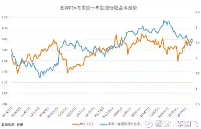 保险公司业绩和利率的相关性越小,分析师给公司的估值就越高,友邦保险就做得很好,我们看一下它的PEV走势和美国十年期国债利率的关系(友邦保险开展业务的主要国家的利率水平普遍深受美国利率的影响,因此选择美国十年期国债利率来作利率模拟)。