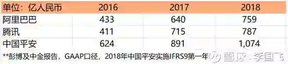 2016年,平安净利润624亿,超过了阿里和腾讯的433亿和411亿;2017年,平安净利润891亿,超过了阿里和腾讯的640亿和715亿;2018年,平安净利润1074亿,超过了阿里和腾讯的759亿和787亿,平安连续完胜三年。