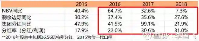 这还会带来几个重大好处:相对于偿一代,偿二代下当年新业务价值(NBV)增加了,内含价值(EV)增加了,当年的净利润也增加了,这样导致分红也增加了,下表充分说明了这一点,2015年本来已经是保险业非常兴盛的一年,各项指标已经很不错了,而2016年实施偿二代后,当年NBV激增64.7%,剩余边际(比较复杂的保险概念,是净利润的主要来源,不详细阐述了 )大增37.4%,集团分红大增41.5%(第二年又增长了99.1%),分红率从2015年的17.9%增长4.1个基点达到22%(第二年又增长了8.6个基点到30.6%),在经营环境非常困难的2018年,平安的NBV仍实现7.3%的增长,剩余边际、集团分红仍然有27.6%和 21.9%的可观增长,分红率也达到了31%,这样的一个成绩,除了平安员工工作非常努力之外,偿二代也起了很大的作用。