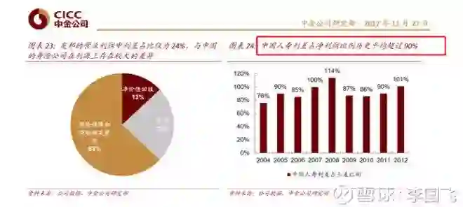 很明显,友邦的PEV和美国国债收益率相关性比较小,它是怎么做到的?友邦产品中NBV死差费差占比高达80%左右,EV死差费差占比高达75%--80%,所以它的业绩受利率的影响就很小,分析师很喜欢,给它的PEV估值长期在2倍多。中国几个大的保险公司估值一直很低,除平安之外现在还是0.8倍左右,如果用EV+NBV*N公式给它们估值,N居然是负的,个中原因很多,但最核心的原因是业绩受利率影响太大了。下图来自中金公司在2017年11月底的一份报告,显示友邦的营业利润中利差占比仅为24%,而中国人寿利差占净利润比例历史上平均超过90%,除平安外的几家大保险公司近年来都在积极转型,提升长期保障型产品的销售比重,也都有进步,但是效果还不算太显著。平安这方面和友邦还有不少的距离,但进步很大,增速很快,我估计再过四五年,死差费差占NBV和EV的比重有望接近友邦。