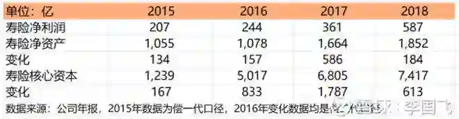平安在公司业绩ppt里是这样表述的:“偿二代下,剩余边际被认可为资本,为实际资本的重要组成部分;偿二代下,如果新业务盈利能力较强,其剩余资本大于要求资本,贡献资本”,这段话有很多专业术语,不容易理解,我用更通俗易懂的文字表述一下,寿险业务以前一直是重资产业务,原因是卖保险需要消耗资本金,如果不补充,则严重影响业务扩张。偿二代会计准则较偿一代最大的改变是,已销售的保险产品(主要是指盈利能力强较的长期保障型产品)未来的利润可以折现回来补充资本,下图是平安寿险净利润、净资产与核心资本增加的关系。
