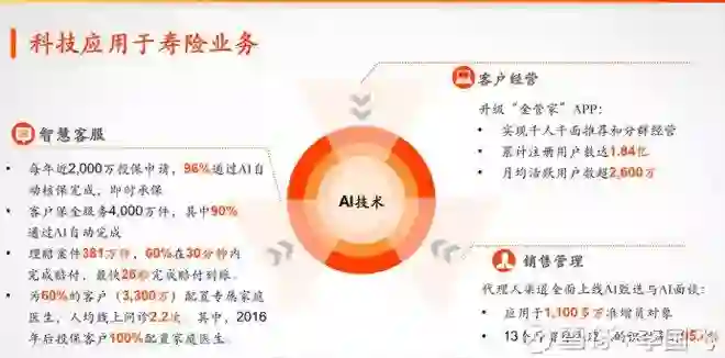 在金融服务领域,平安人工智能技术已涵盖智能预测、智能风控和智能服务等领域,为客户提供快速理赔、智能双录、中小型企业贷款审批和智能客服等功能。在智能风控领域,平安通过端到端线上化的微表情面审风控系统,与人工审核的匹配度近90%,可节约近40%的人力成本。平安的各项业务都在大规模应用集团高科技研发的成果,显著提升了工作效率和竞争力,以寿险业务为例,具体见下图的介绍。