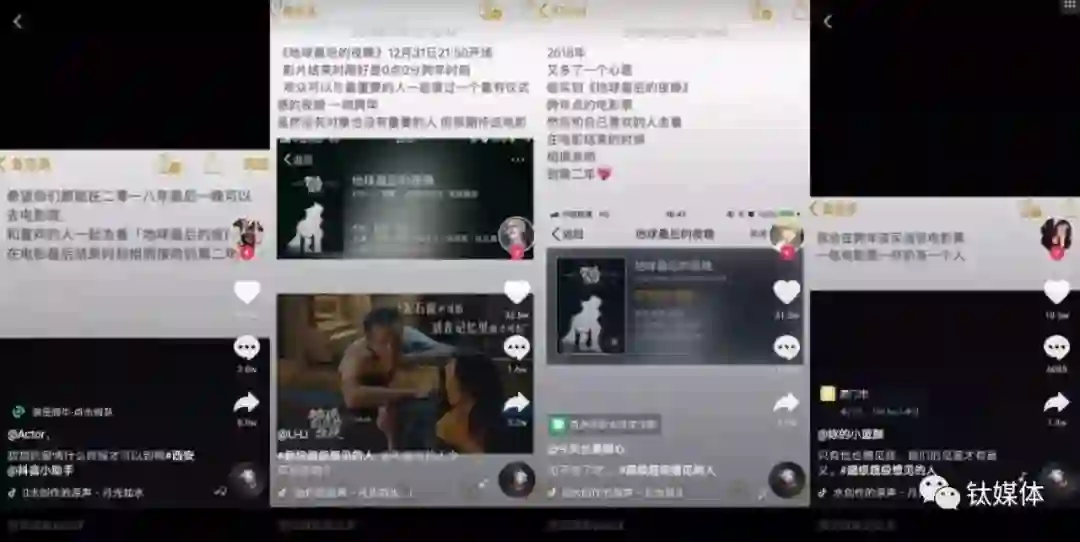 更有趣的是,由于抖音本身创作模式中配乐的高传播属性,在后续借助BGM诞生的UGC中不少内容已经完全与备忘录形式无关,但是在作品中却依旧保留着跨年看电影的核心要素,无形中自发为电影开辟了另一条音乐裂变通路。