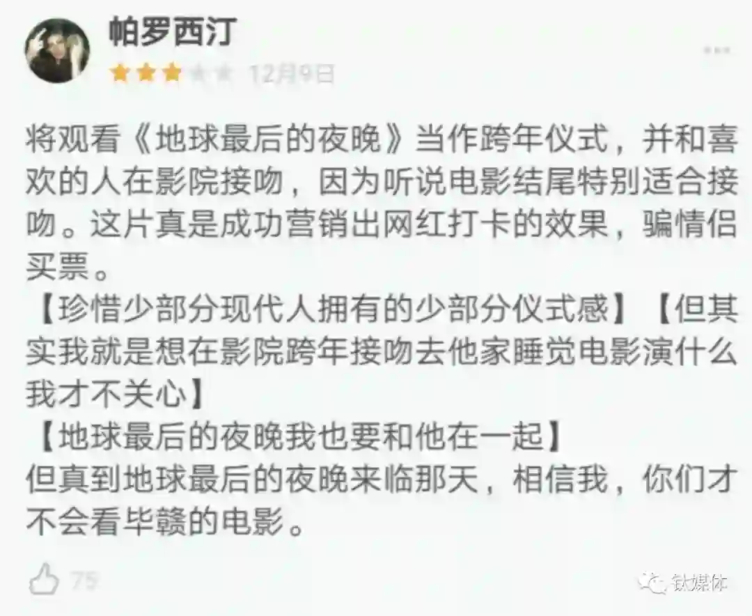 主打浪漫仪式感的营销策略,吸引到了大量冲着“一吻跨年”而来的年轻群体,贡献了超1.5亿的预售票房同时,猫眼、豆瓣开始被负面差评占据。截止发稿前,猫眼评分2.8,豆瓣评分从7.5跌至6.8。
