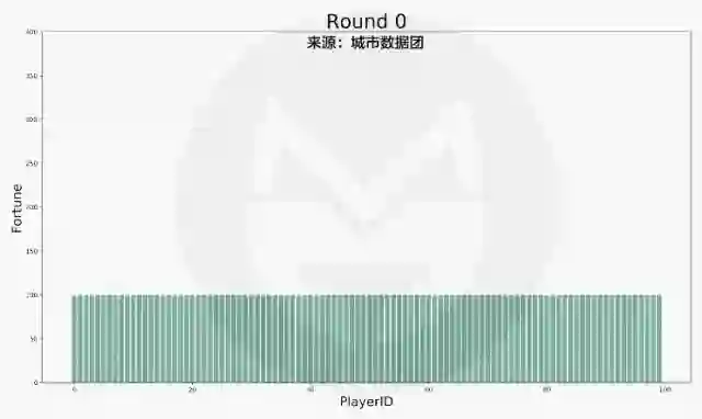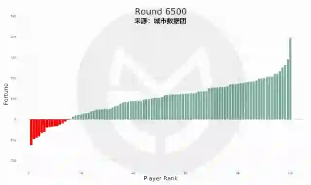 (说明:1.上图中横轴标签代表一个玩家的编号,柱子的高低变动反映该玩家财富值的变化。2. 当某人的财富值降到0元时,他在该轮无需拿出1元钱给别人,但仍然有机会得到别人给出的钱。)