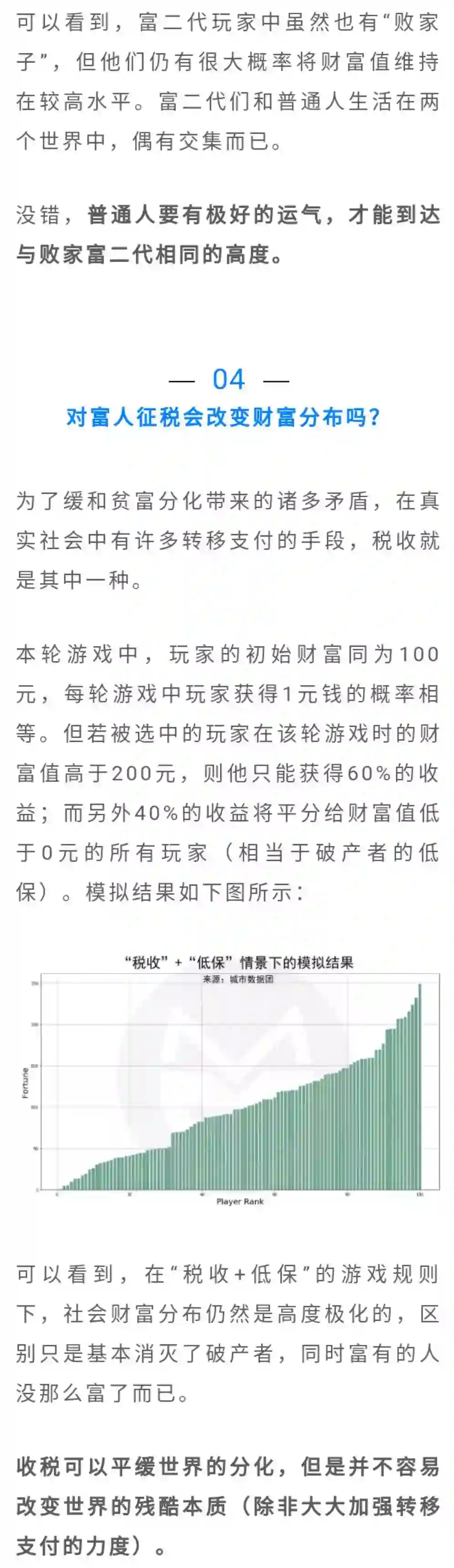 虽然这个分布形态与全是普通玩家的结果基本一致:top10和top20的富人掌握的社会财富比例和负债的人数比例都差不多,但是仔细来看,top5富人中的全部,以及top10富人中的7位都是富二代玩家。