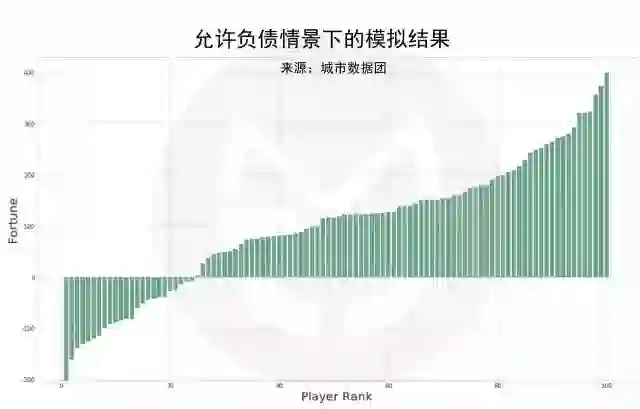 本次模拟结果中,有15个人在35岁的最后一天时处于破产(负债)状态,而他们在此后的财富值及排名如下图所示: