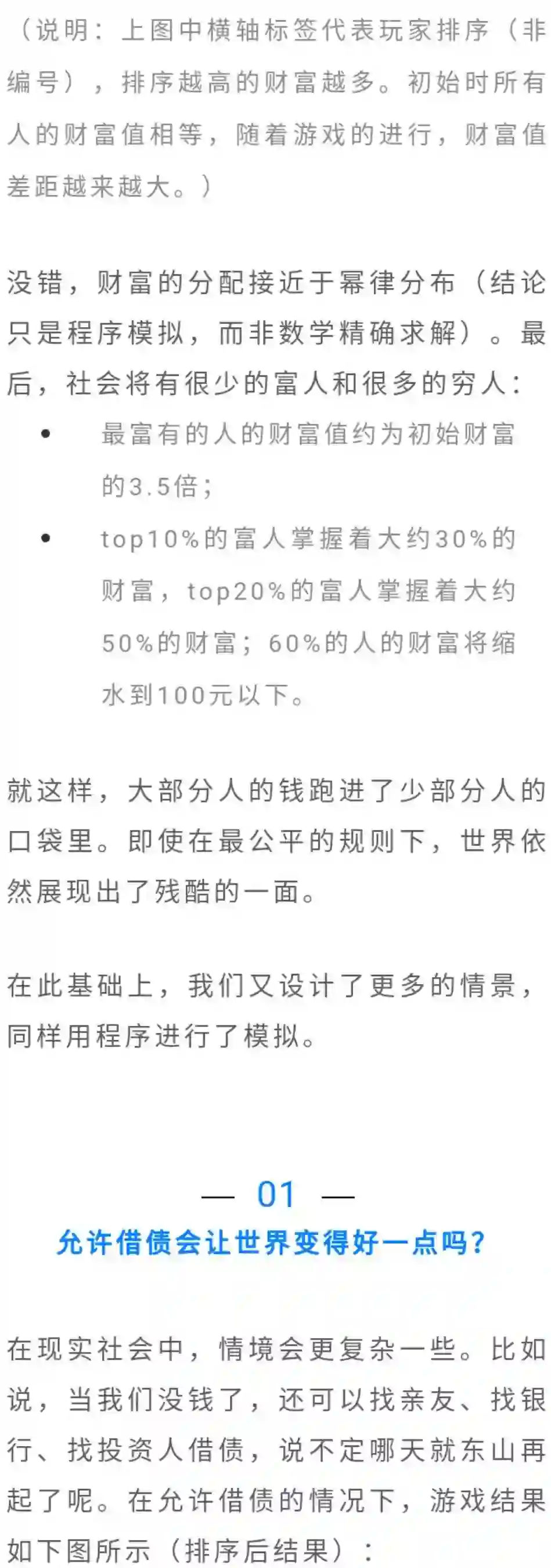 1. 本文中的结果由计算机程序模拟得到,而非数学精确求解。尽管文中做了多种假设,但实际的社会财富分配机制仍比模型中复杂许多。模型简化了很多因素,给出的结果与真实社会仍然存在相当大的差异。