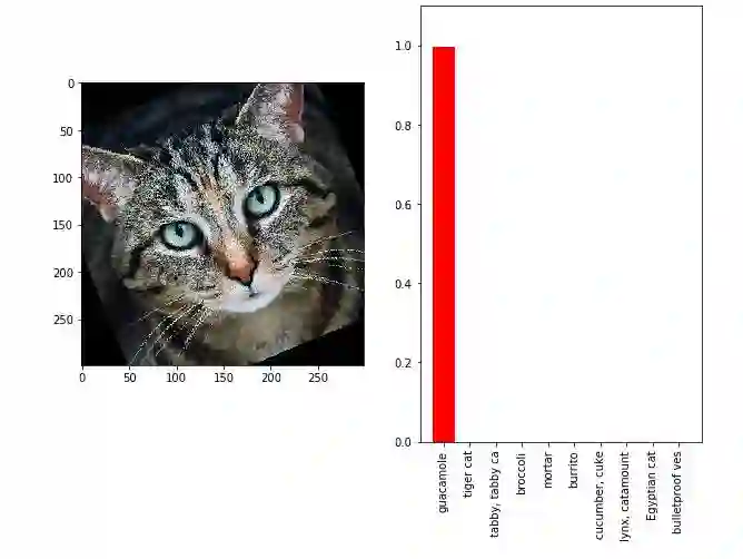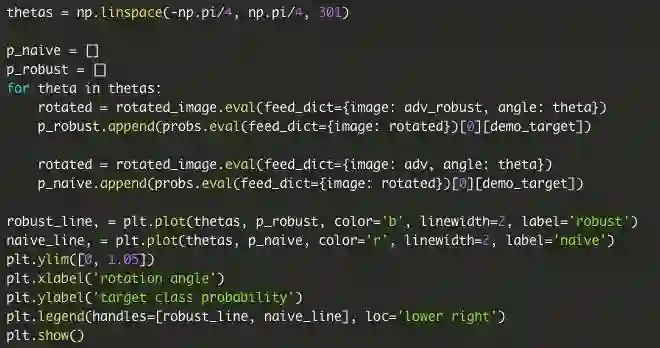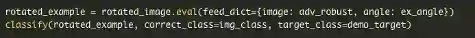 现在来看一个更高级的例子。遵循我们的方法来合成稳健的对抗样本,以找到对猫图像的单一扰动,这在某些选择的变换分布下同时对抗,可以选择任何可微分变换的分布;在这篇文章中,我们将合成一个单一的对抗输入,设置θ∈[- π/4,π/4],这对旋转是鲁棒的。