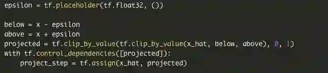 最后,编写投影步骤,使得对抗样本在视觉上与原始图像相似。另外,将其限定为[0,1]范围内保持有效的图像。