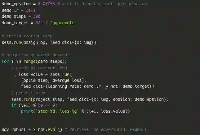 在这个框架中,对抗样本是解决一个约束优化的问题,可以使用反向传播和投影梯度下降来解决,基本上也是用与训练网络本身相同的技术。算法很简单: