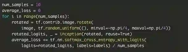 那么,如何使得一个对抗样本对变换的分布是鲁棒的呢?给定一些变换分布T,我们可以最大化Et~TlogP(y'|t(X')),约束条件为‖X- X'‖∞≤ε。可以通过投影梯度下降法来解决这个优化问题,注意到∇Et~TlogP(y'|t(X'))与Et~T∇logP(y'|t(X'))相等,并在每个梯度下降步骤中来逼近样本。