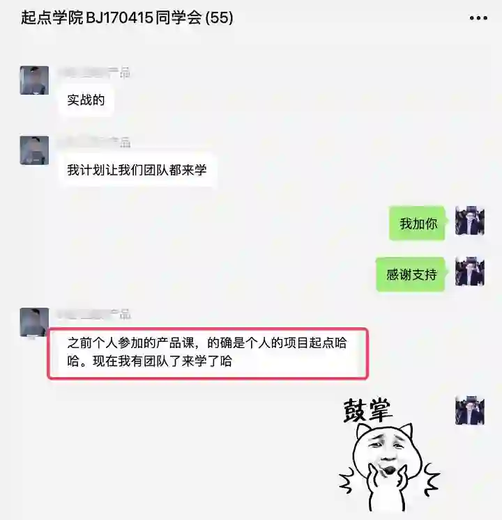 比如,17年【产品经理实战训练营】的老学员,通过实战营的学习,将所学方法很好的运用在自己的工作中,在3年后拥有了自己的产品团队,并带着自己的产品团队重返产品实战营学习。