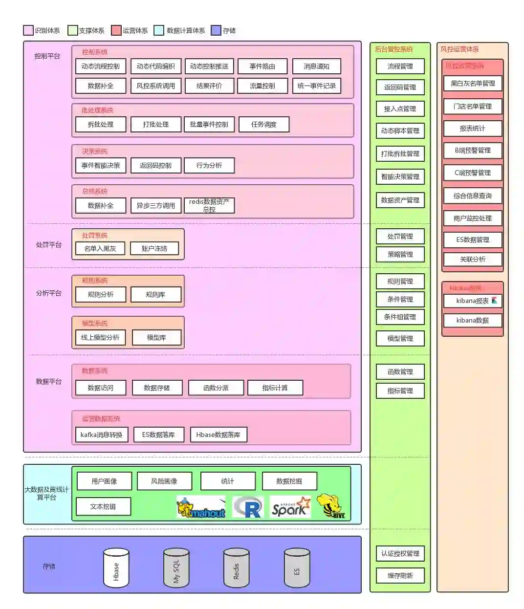 识别体系包括控制平台(控制系统,批处理系统,决策系统,总线系统),处罚平台(处罚系统),分析平台(规则系统,模型系统), 数据平台(数据系统,运营数据系统)。