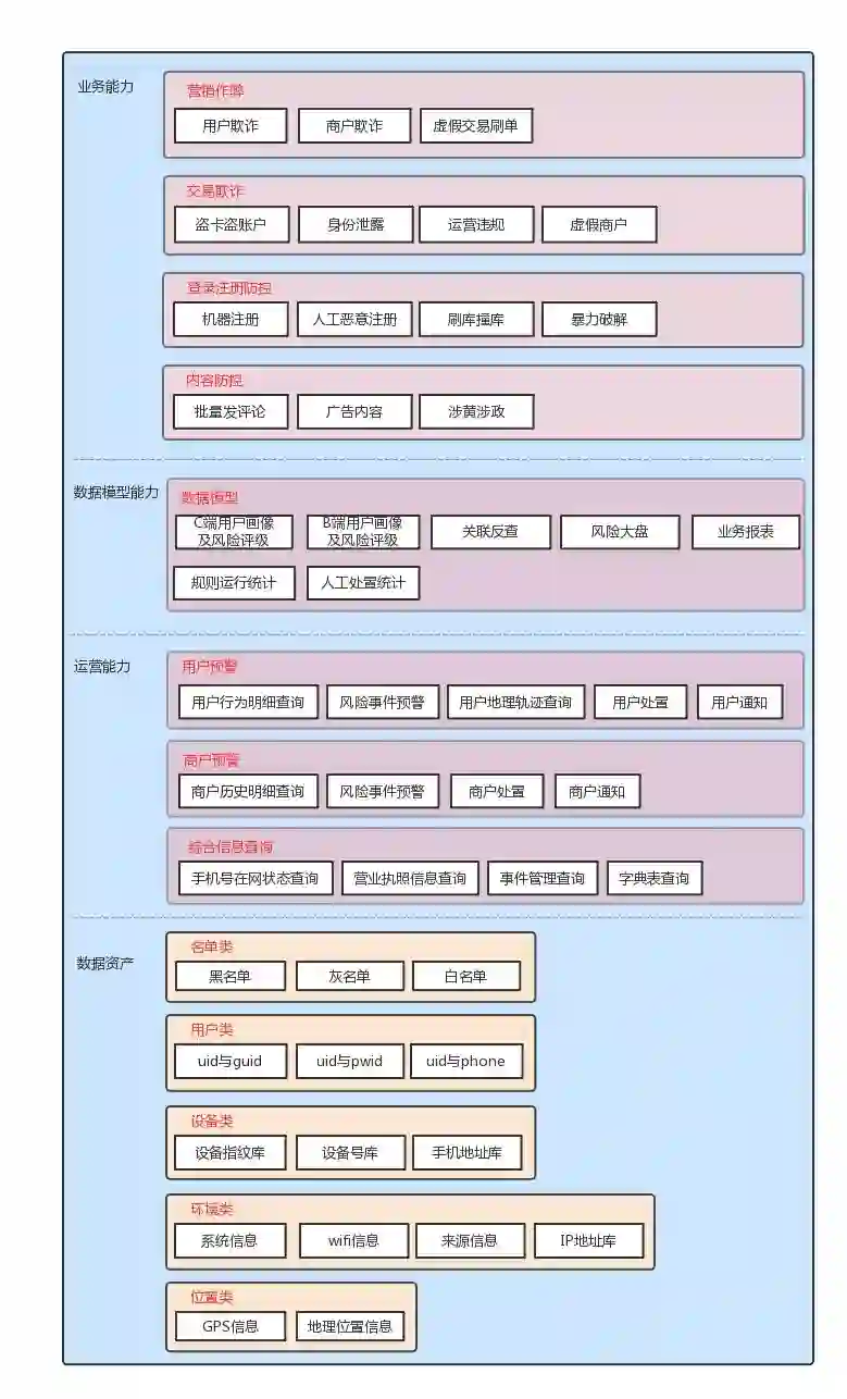 业务能力有,营销作弊,交易欺诈,登录注册防控,内容防控