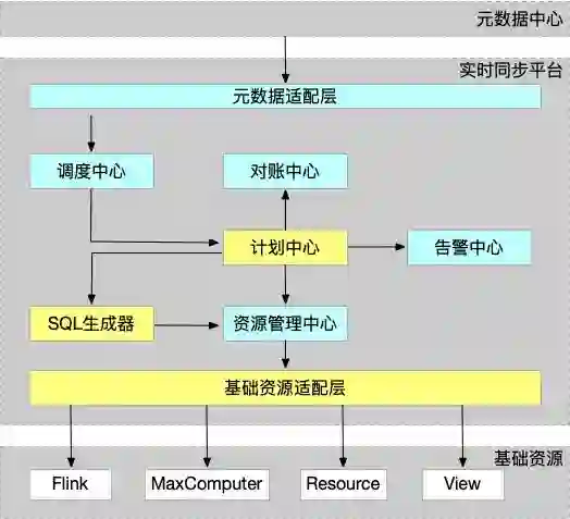 基础资源适配层主要借助集团基础资源管理能力串联阿里各类数据服务, 比如阿里云MaxComputer、Flink、阿里云AnalyticDB等。