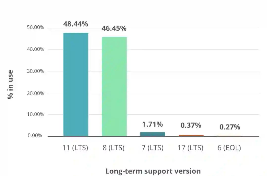 不过,据 New Relic 于 4 月发布的一项关于《Java 生态系统》的研究报告显示,在长期支持的版本中,仍有 1.71% 的应用程序在生产环境中使用 Java 7。同时,Java 6 虽已经不再受支持,但 0.27% 的应用程序在使用。调查显示,大多数使用 Java 6 和 Java 7 的应用程序都是尚未升级的旧版应用程序。