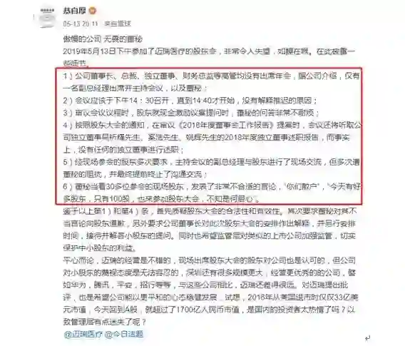 2019年5月13日晚间,有投资者在雪球平台发帖表示,5月13日下午参加了迈瑞医疗的股东会,非常令人失望,该投资者称,董秘当着30多位参会的现场股东,发表了非常不合适的言论,“你们散户”,“今天有好多股东,只有100股,也来参加股东大会,不知是何居心”。