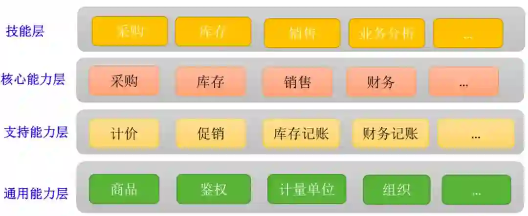 我们抽取像产品、计量单位、组织等能力域后,再把这些能力进行分层,像应用层,还有领域层。领域层包括核心层、支持层、通用层。核心层包含核心领域服务,一般是业务人员可感知的,一般映射为具体业务部门;支撑层包含支持一般是支持业务的某一方面的能力服务;通用层包括一些公共能力服务,例如产品、计量单位等。