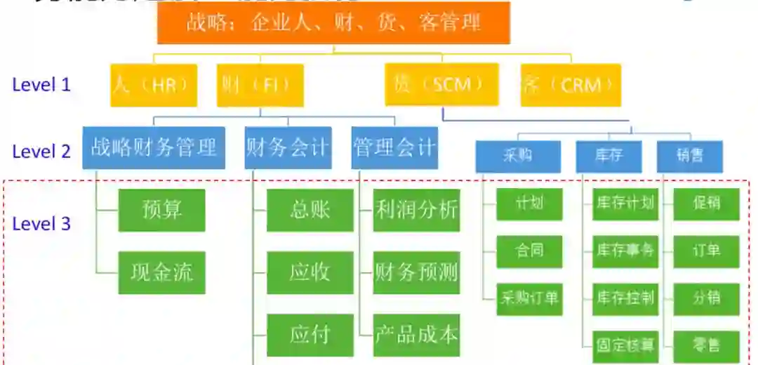我们首先从人、财、货、客这个角度进行拆分。例如,财务属于核算的范畴,从业务的高度视角拆分为战略财务(决策层)、财务会计(对外)和管理会计(对内)。