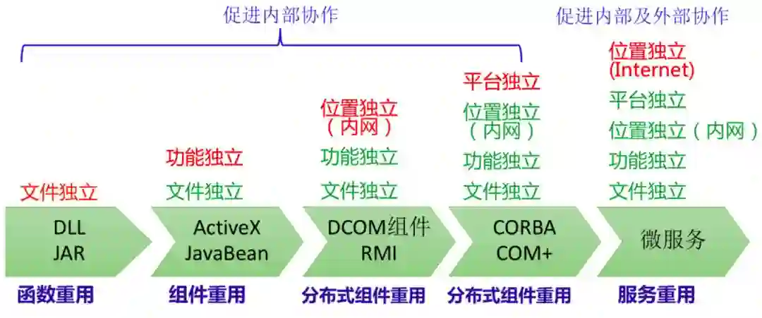 随着函数越来越多,查询和使用共享功能变得复杂,我们就把类似的函数、功能有机组合在一起,封装成所谓的组件,也就是Windows平台的ActiveX组件和JAVA平台的JavaBeans组件,这也就是我们通常说的组件重用。该种技术要求调用者和被调用者必须在一个机器和进程上,使用上受到位置的约束。