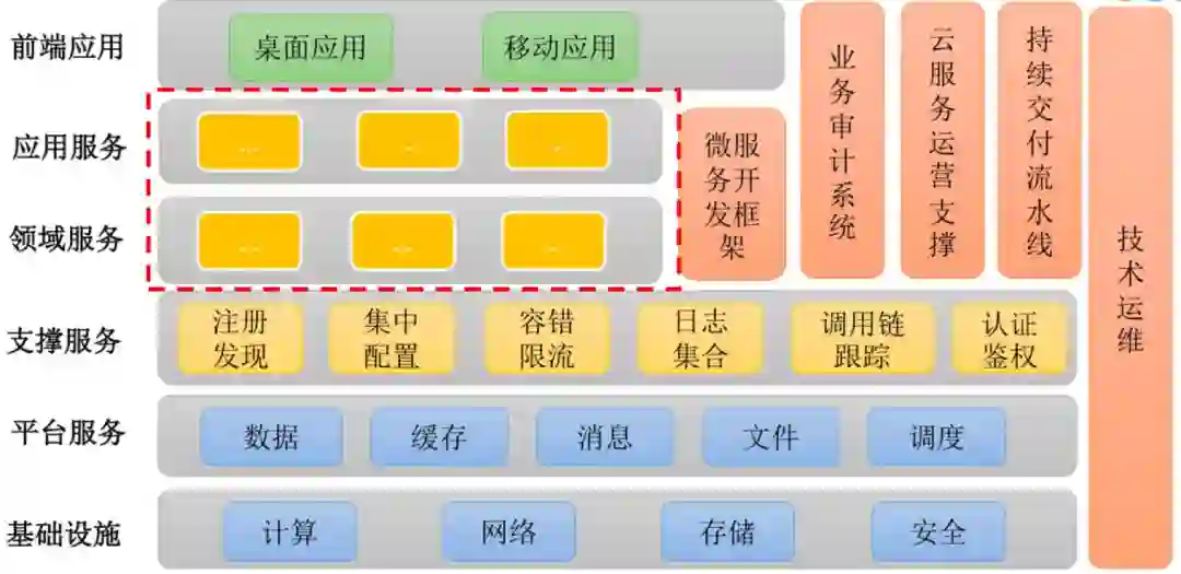 这个是大家在一些讲座或者是网站看到的微服务架构图,基本上都是类似的,基础服务、平台服务、支撑服务还有领域服务,我今天要讲的这一块就是应用服务和领域服务的建模,这块内容离问题最近,解决问题更有效。