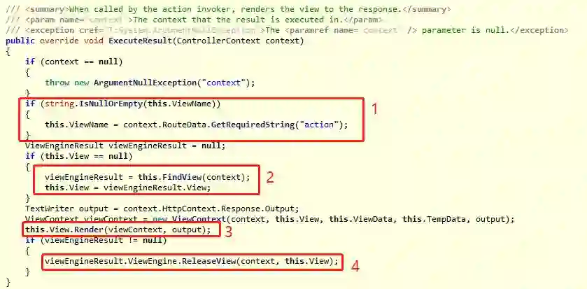 从代码中可以容易的看出,ASP.NET MVC中View的渲染工作主要有四步:
