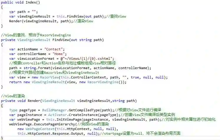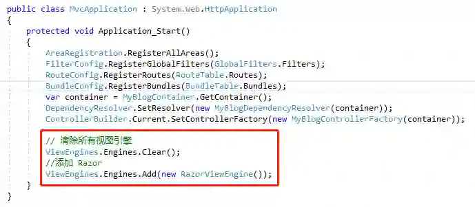 注:从上面的错误信息中可以看到ASP.NET MVC在查找View时,除了匹配了.cshtml和.vbhtml的文件外,还匹配了.aspx和.ascx的文件,后者是Web Form框架的页面文件,这是为什么呢?因为默认情况下ASP.NET MVC中会包含MVC使用的Razor 引擎和Web Form使用的Web Form引擎,所以在纯使用MVC开发的情况下,为了优化性能,一般会通过以下代码将Web Form的引擎删除: