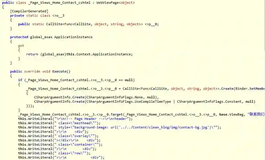 从代码中证明了之前的猜想,View文件编译后确实是WebViewPage的子类型,而该类型中的Execute方法是将Html代码以字符串的形式进行了拼接,拼接过程中如果遇到特殊方法的调用则拼接特殊方法的返回值: