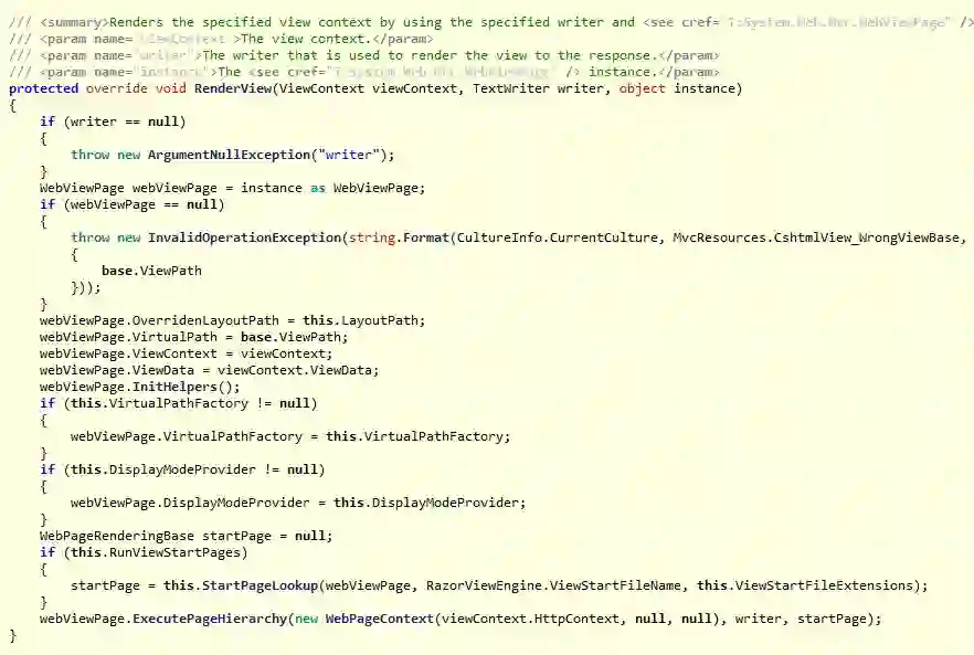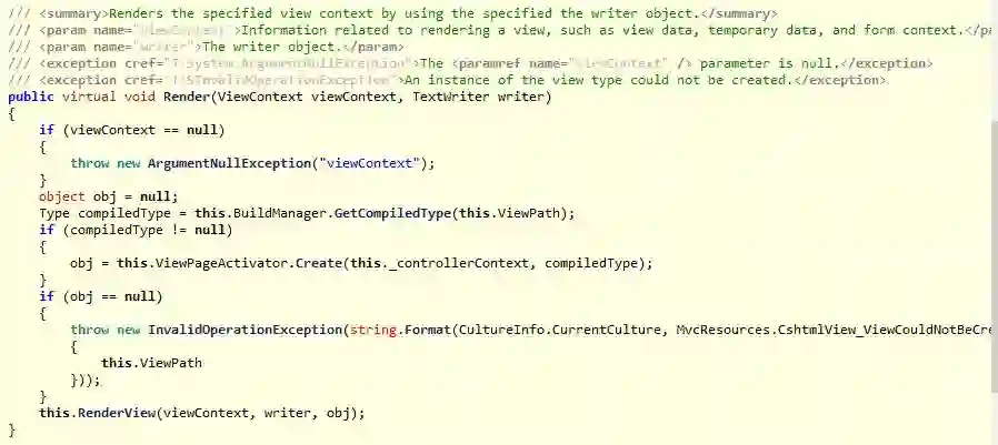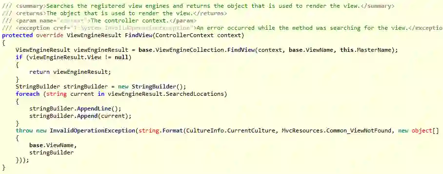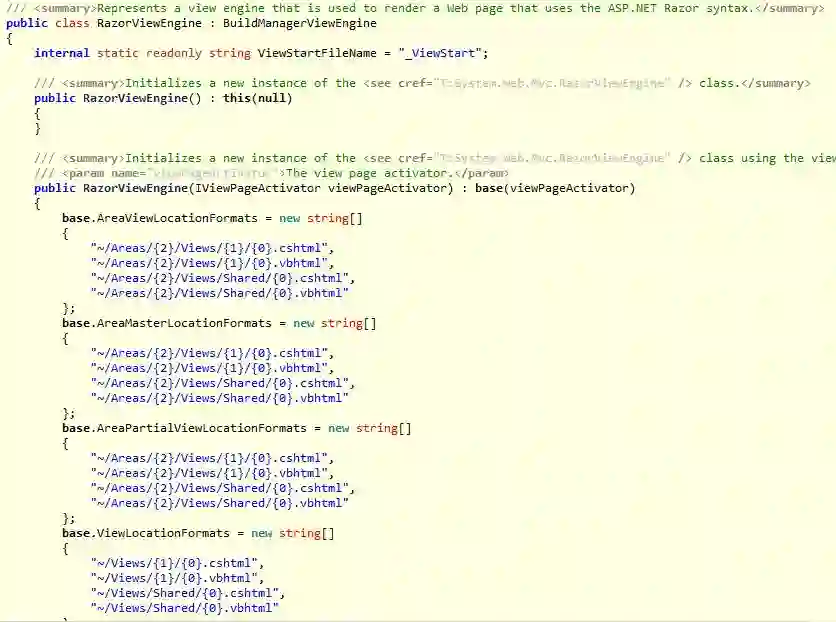 MVC中主要使用的是RazorViewEngine,下图是RazorViewEngine的部分代码: