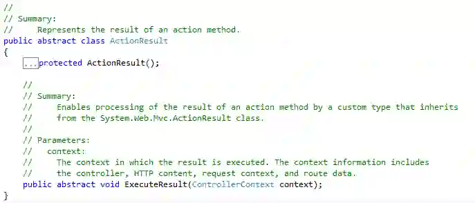 ActionResult的定义如下,它包含了一个名为ExecuteResult的方法,该方法用来完成对action方法执行结果进行处理:
