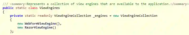 ASP.NET中的ViewEngine被一个名为ViewEngines的集合进行管理,如下图: