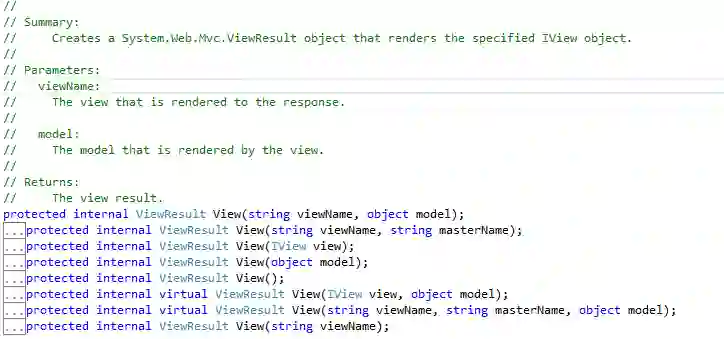 回到最初提到的View()方法,该方法定义在Controller中,它的返回值是一个ViewResult类型: