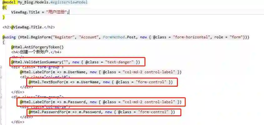 在ASP.NET MVC的View中可以通过一些Helper类型来生成HTML代码,下图为用户注册页面的View代码:
