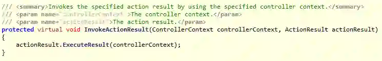 Action方法是由ActionInvoker完成执行的,Action返回的结果是一个ActionResult类型,Action执行后ActionInvoker又调用了ActionResult的ExecuteResult方法完成特定的操作,相关代码如下所示: