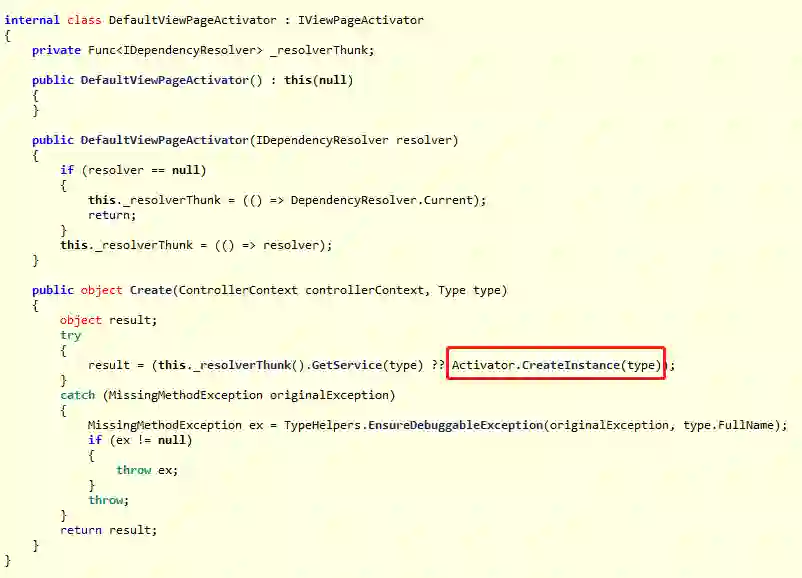 2. 通过激活器创建View编译后的类型,下图是默认使用的激活器,其核心是通过依赖解析器或者Activator来直接创建类型实例。