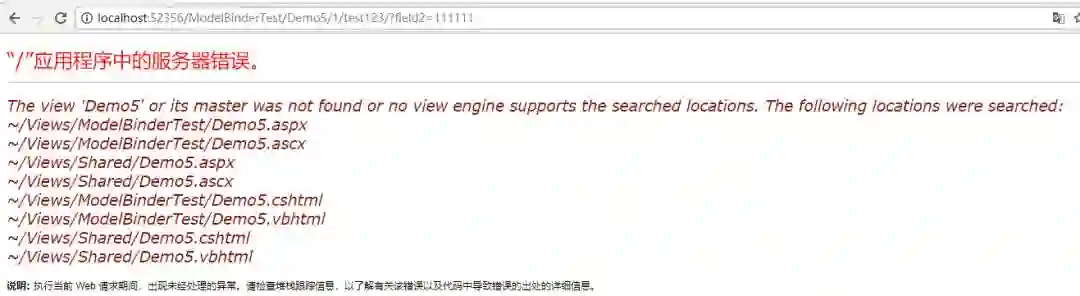 从代码可以看出它是通过一个ViewEngineCollection对象,根据ViewName(默认是actionName)去查找View的,如果找到返回一个ViewEngineResult类型,否则将抛出异常,异常中包含查找的位置: