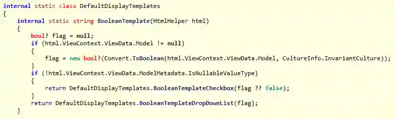 Display与Editor是根据模型的数据类型来判断如何对模型进行展示。ASP.NET MVC中为Display和Editor提供了一些基础类型的默认模板实现分别通过内部静态类型DefaultEditorTemplates和DefaultDisplayTemplates进行存储,下面是bool类型模板代码: