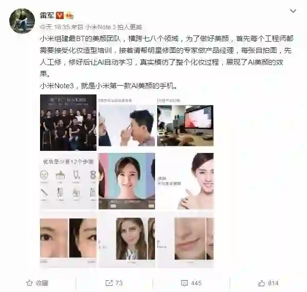 雷军表示:“小米组建最BT的美颜团队,横跨七八个领域,为了做好美颜,首先每个工程师都需要接受化妆造型培训,接着请帮明星修图的专家做产品经理,每张自拍图,先人工修,修好后让AI自动学习,真实模仿了整个化妆过程,展现了AI美颜的效果。”