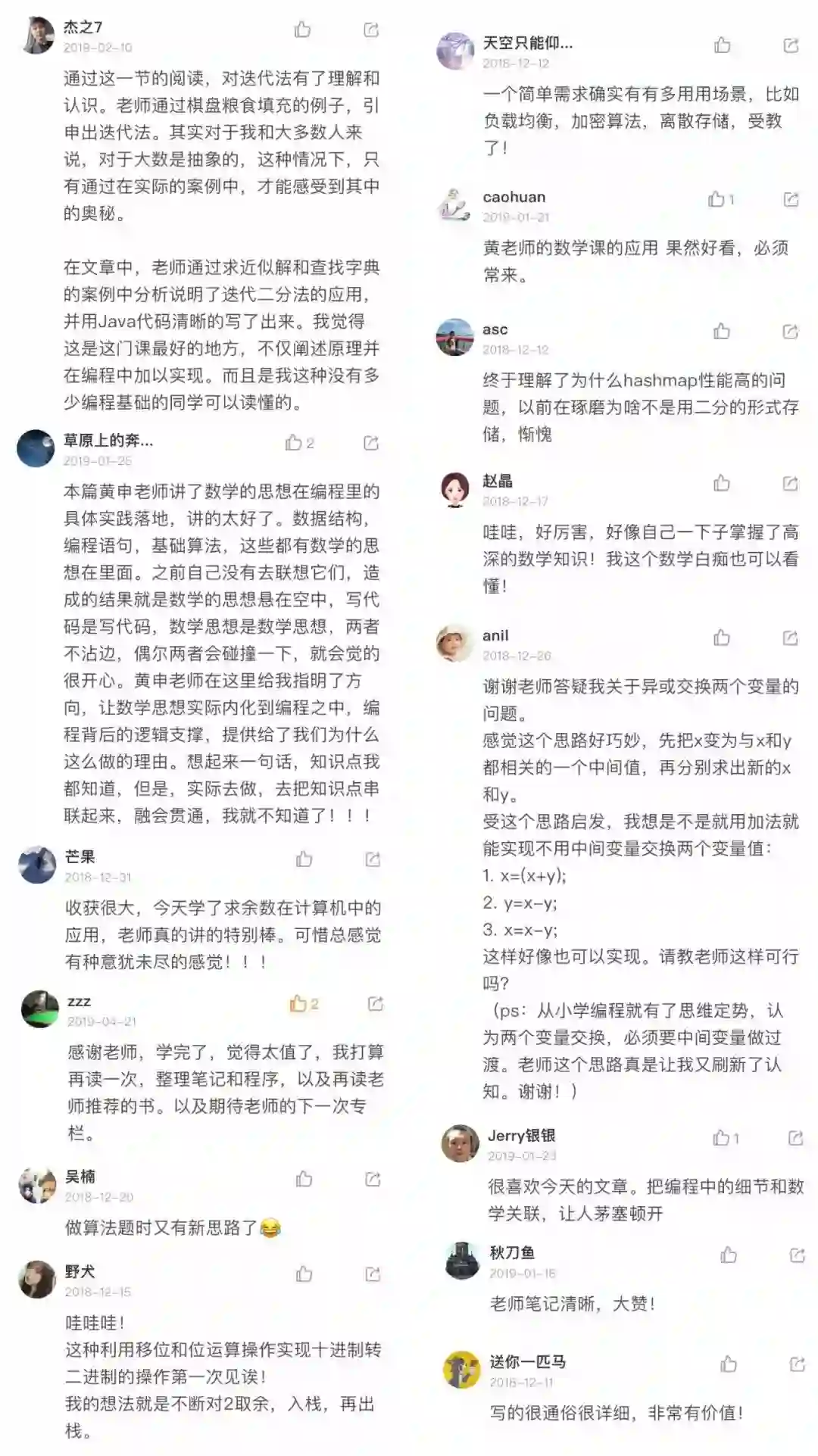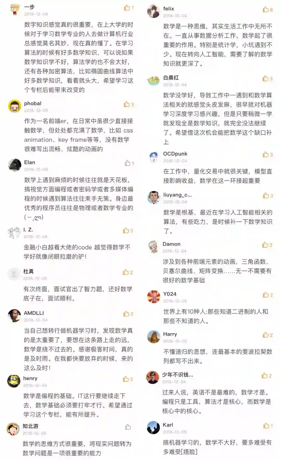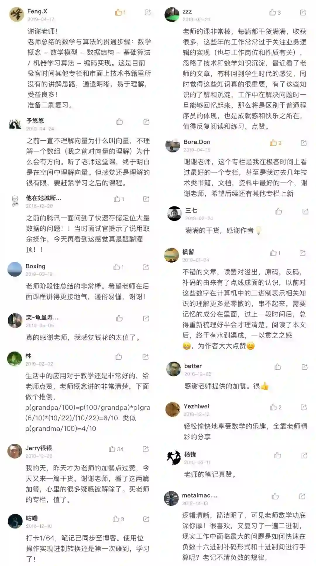 他的专栏《程序员的数学基础课》上线不过 5 个月,已经有超过 2W 人订阅了,截了点评价给你们作参考: