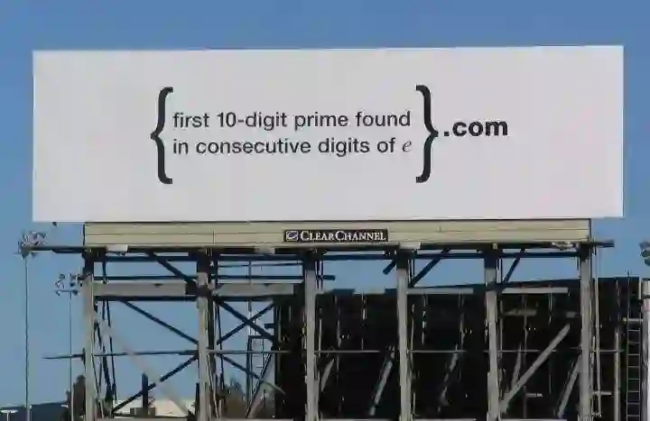 2004 年,在硅谷的交通动脉 101 公路上出现了一块巨大的广告牌,上面是道数学题:{ e 的连续数字中最先出现的 10 位质数 }.com。这里的 e 是数学常数,自然对数的底数,无限不循环小数。