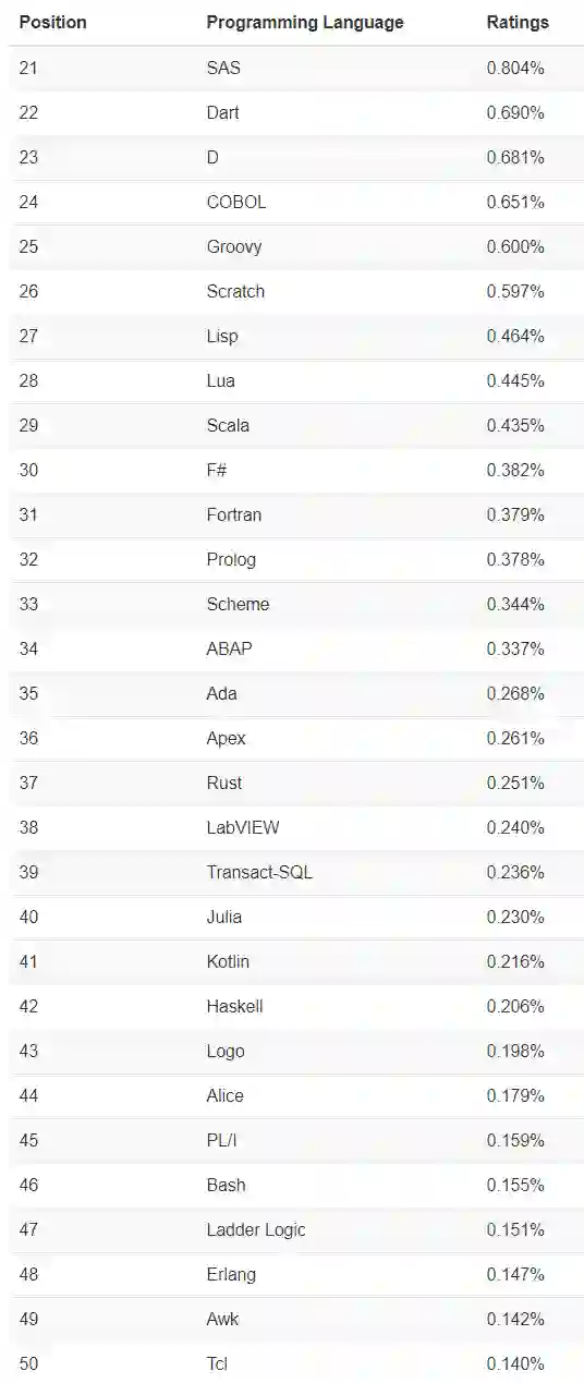 不过,目前编程语言 Top 10 的候选人似乎有 3 位:Swift、Go 和 R,但目前它们还没有人能稳住前10 的位置