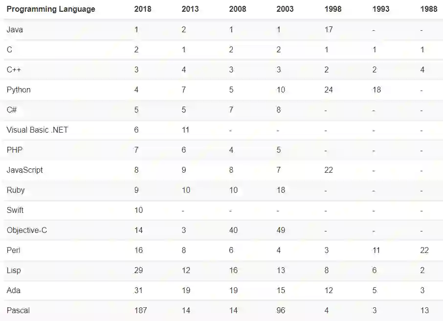 每年我们都希望是一个脱颖而出的新编程语言来获得这个奖项,但对于 2018 年来说,它很可能是一门成熟的语言。因为现在的新编程语言,取得的分数都太低了,不足以获得“年度编程语言”的称号。例如,上月Apex 从第 46 位跃至第 36 位,而 Alice 从第 62 位跃至第 44 位。但这些都是背景战,因为这两种语言在 2018 年的涨幅都不到 0.5%。还是让我们拭目以待看看哪些语言会胜出吧