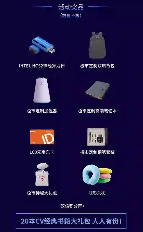 <HAPPY 1024 DAY>#include<stdio.h>Int main(){Printf(“极市,1024”);Return 100元京东卡*10、算力棒*2、极市定制双肩包*2、定制钢笔套装*10、定制高端笔记本*10、加湿器*1、U形头枕*1、神秘大礼包*15、20本CV技术书籍(人人有份)、双倍积分(人人有份);/* at most */}