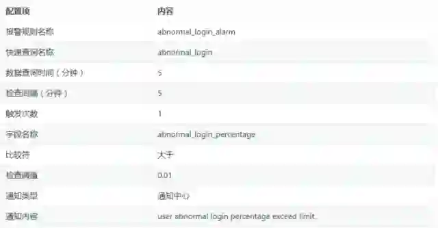 异常登录都会有误判的可能性,因此正常情况下会有少部分异常登录的情况,但异常登录占比要小于1%。这里我们为用户登录设置一个异常登录的告警:若当异常登录占总登录的1%则触发告警。