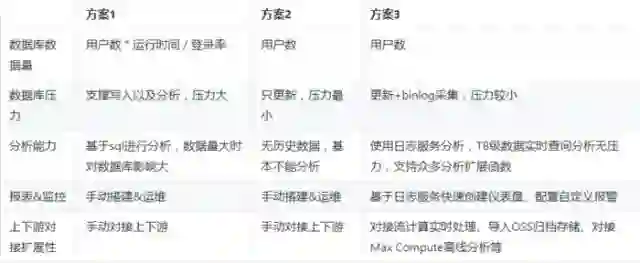 这里我们推荐使用方案2+logtail binlog采集组成最优的方案3:用户最近一次登录信息依然保存在数据库中,通过logtail的binlog功能采集user_login表,logtail会将表中的每次修改事件上传到日志服务,日志服务中的数据可设置保存时间,超时自动删除。同时在日志服务中,可以对实时采集上来的数据进行查询、统计、查看报表、监控报警,也支持将数据对接下游流计算、导入Max Compute/OSS等。
