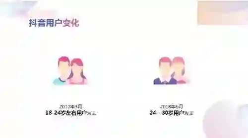 抖音披露的最新用户画像显示,发展至今用户最大的变化体现在年龄结构,在2017年3月,用户以18到24岁为主,到了2018年6月,则是以24到30岁为主。